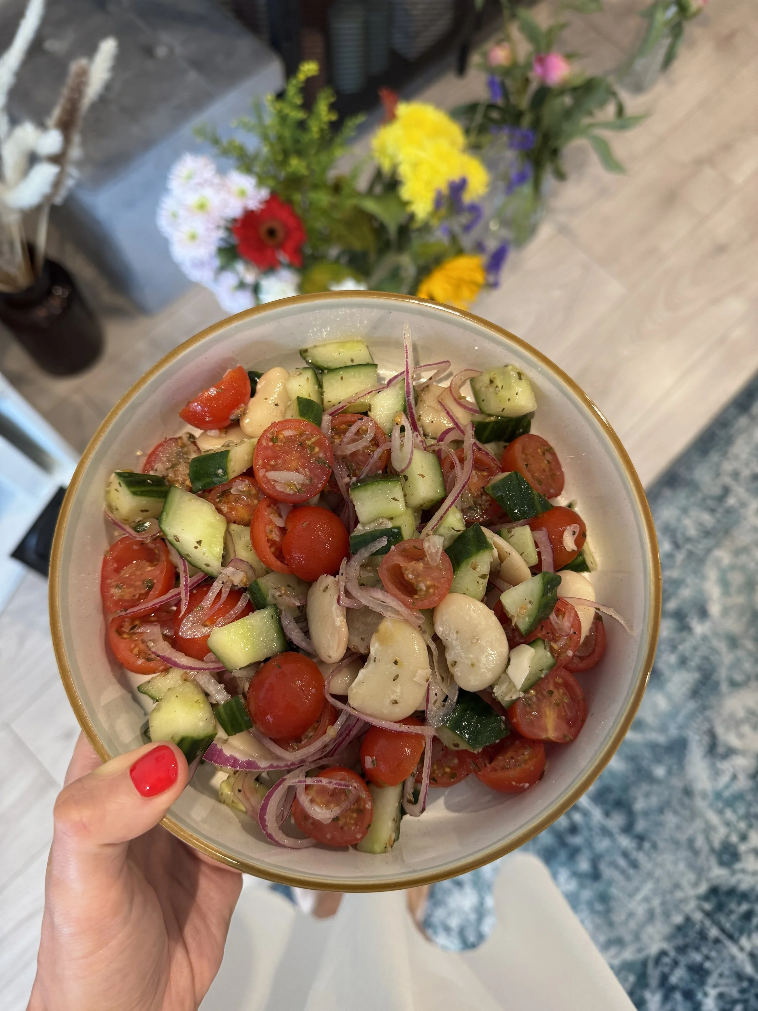 I was recently on my honeymoon in Greece, so of course spent a lot of the time eating Greek salads. I had forgotten how simple and delicious they are. My version here has added beans for protein, and instead of the traditional feta cheese. It works just as nicely!