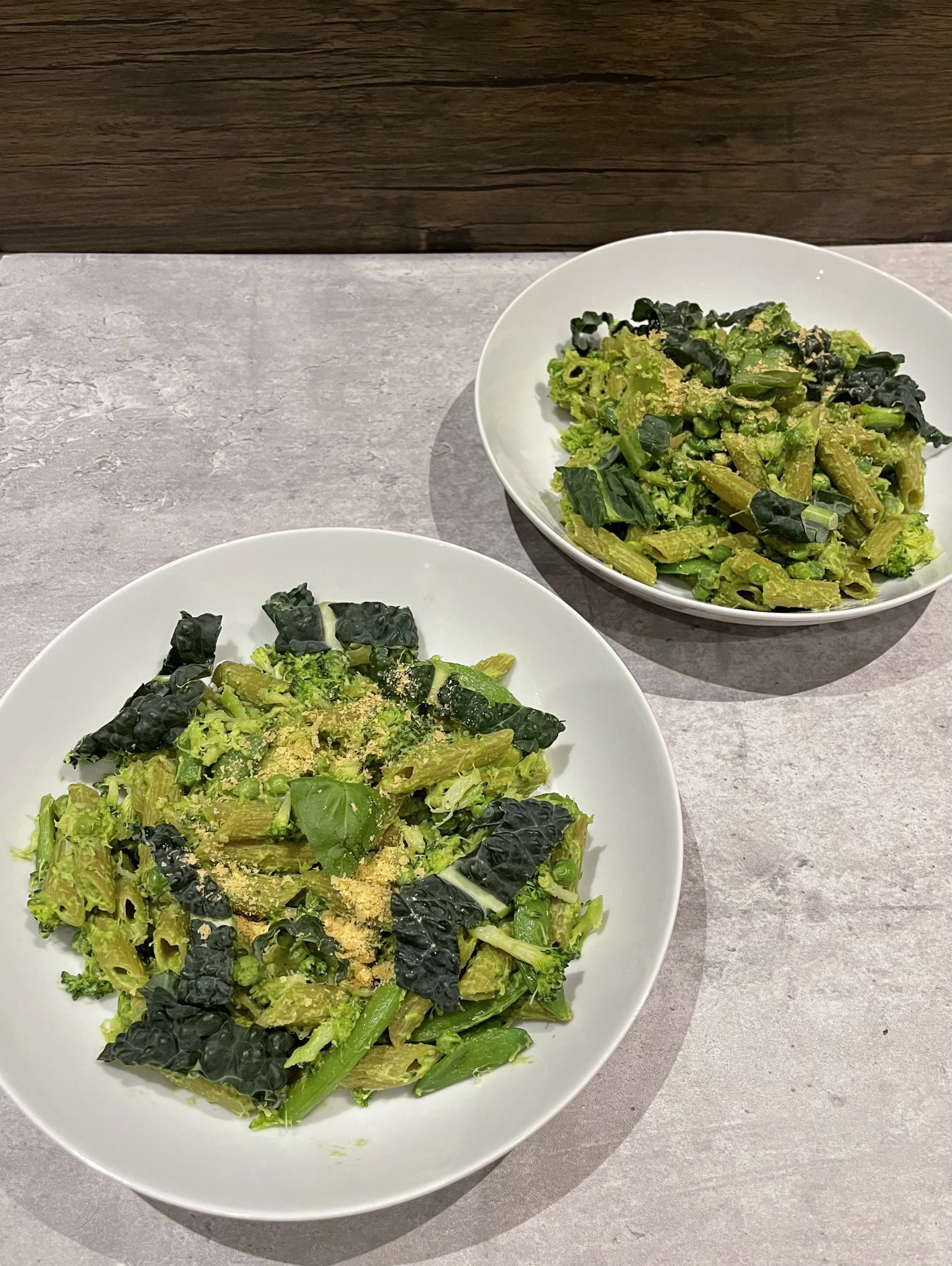 This pasta dish is one of those recipes where you can really use up any green veggies you have lying around. When I made it here, I used broccoli, peas, and sugar snaps. But you could really use any veg you have! It would be equally yummy with cauliflower instead of broccoli (I’m going to use that next time!). The sauce is one you can make so many different variations from once you have your cashew cream basis, but for this recipe, it’s all about the kale!