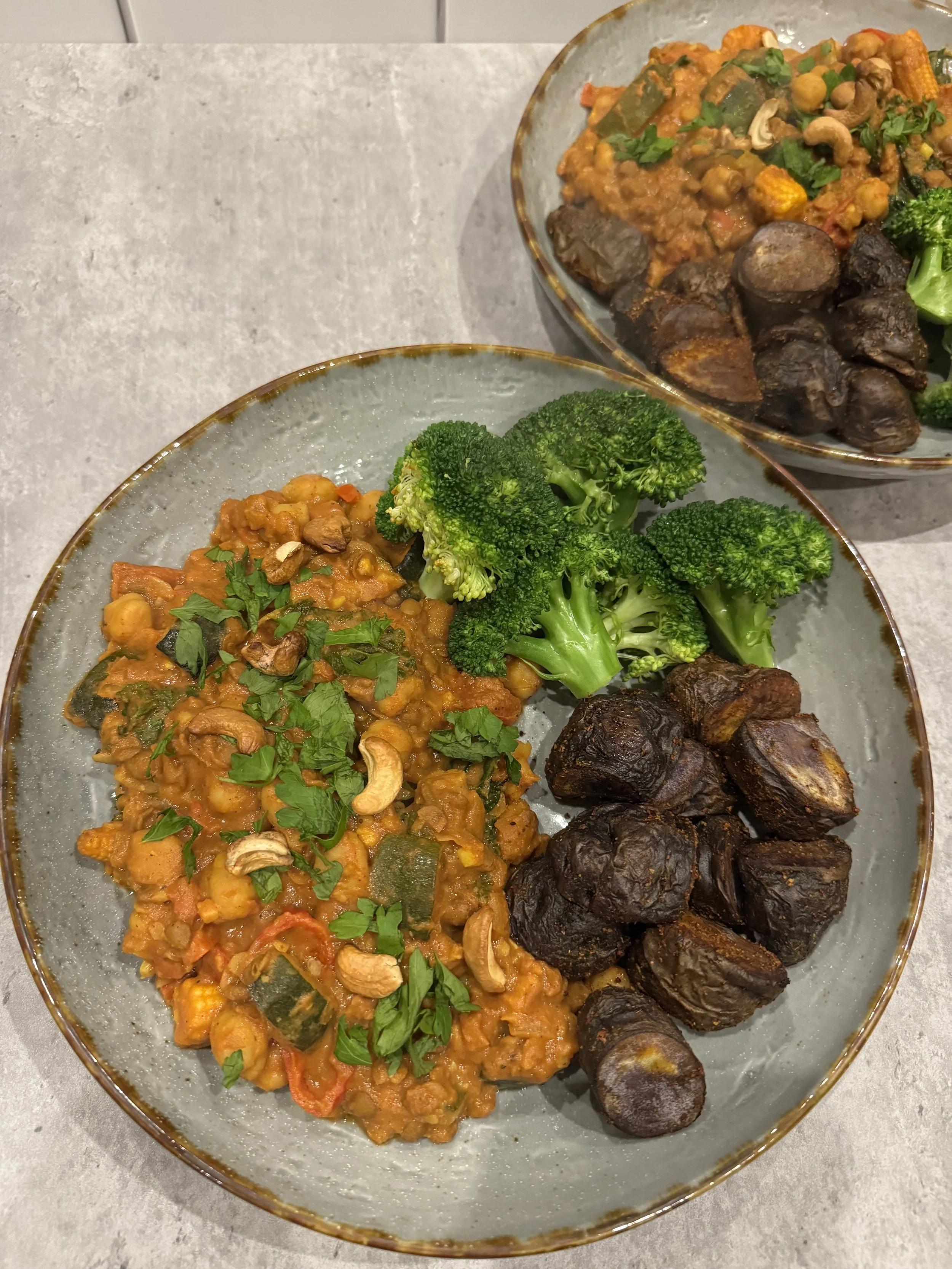 Chop your veg (courgette, peppers, baby corn) and season with olive oil and some tandoori seasoning & garlic granules. Place in the oven for 20 minutes.